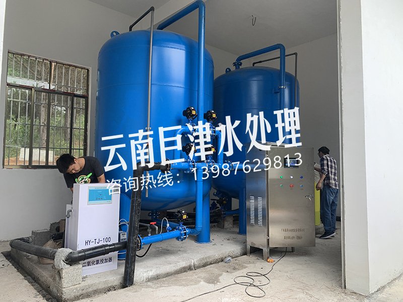 工藝流程:山泉水-絮凝投加器-石英砂過濾器-二氧化氯加藥器-用水點(diǎn)