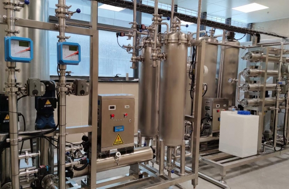 工藝流程:原水箱-原水泵-石英砂過濾器-活性炭過濾器-精密過濾器-紫外線殺菌器-增壓泵-反滲透膜組-加藥系統-無菌水箱-紫外線消毒殺菌器-除菌過濾器-變頻恒壓供水系統-用水點